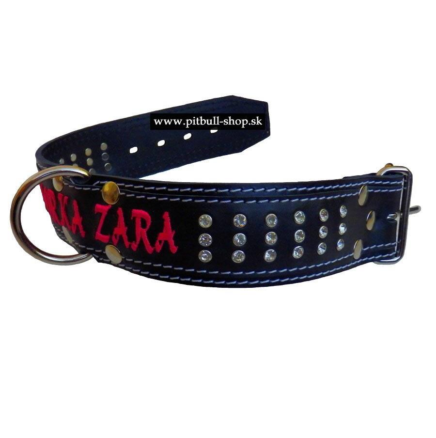Luxusný kožený obojok s výšivkou do kože. Vyrobený z pravej hovädzej kože zdobený kamienkami, odolný, vhodný pre silné plemená. Možnosť zvoliť nápis na obojku, font, a farby nite na výšivku. Šírka obojku 5cm.