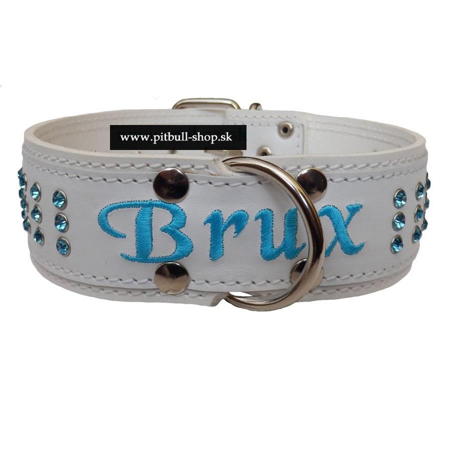 Luxusný kožený obojok s výšivkou do kože. Vyrobený z pravej hovädzej kože zdobený kamienkami, odolný, vhodný pre silné plemená. Možnosť zvoliť nápis na obojku, font, a farby nite na výšivku. Šírka obojku 5cm.