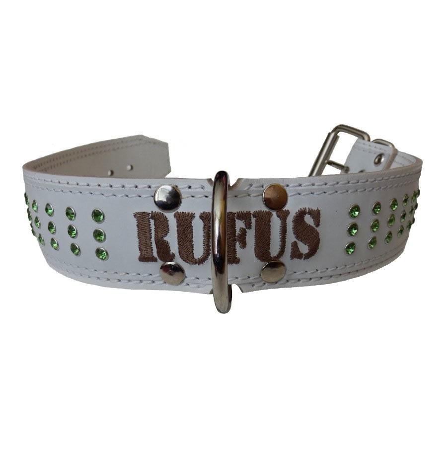 Luxusný kožený obojok s výšivkou do kože. Vyrobený z pravej hovädzej kože zdobený kamienkami, odolný, vhodný pre silné plemená. Možnosť zvoliť nápis na obojku, font, a farby nite na výšivku. Šírka obojku 5cm.