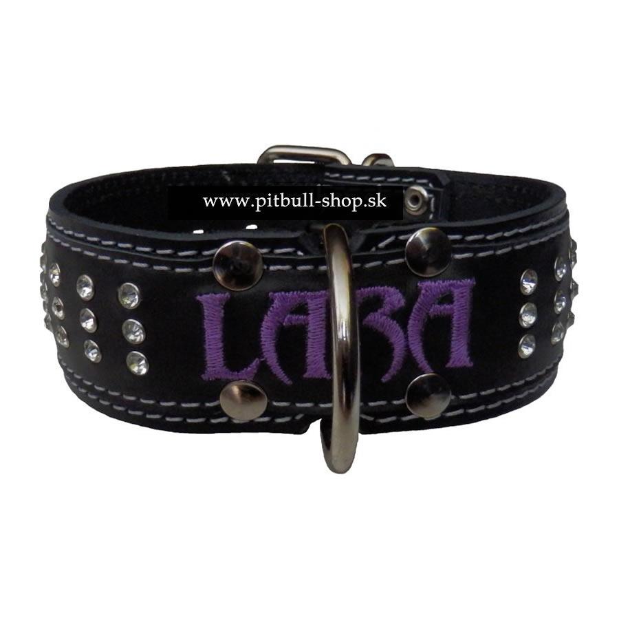 Luxusný kožený obojok s výšivkou do kože. Vyrobený z pravej hovädzej kože zdobený kamienkami, odolný, vhodný pre silné plemená. Možnosť zvoliť nápis na obojku, font, a farby nite na výšivku. Šírka obojku 5cm.