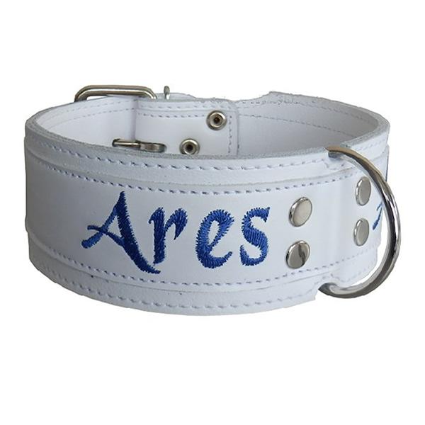 Luxusný kožený obojok s výšivkou do kože. Vyrobený z pravej hovädzej kože, odolný, vhodný pre silné plemená. Možnosť zvoliť nápis na obojku, font, a farby nite na výšivku. Šírka obojku 5cm.