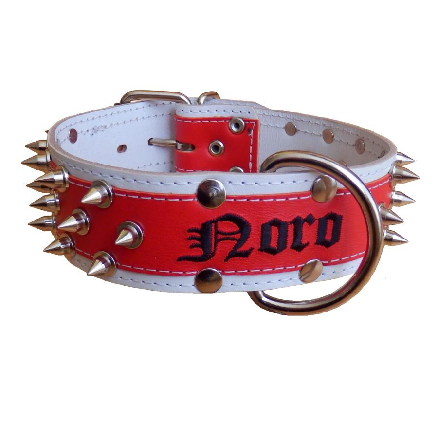 Úvod »OBOJKY»Kožené s výšivkou»6cm » Obojok kožený 6cm s výšivkou+hroty - biely, červený