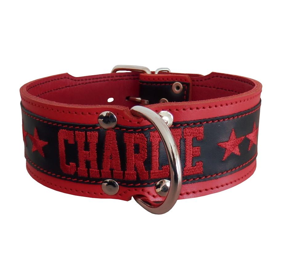 Luxusný kožený obojok s výšivkou do kože. Vyrobený z pravej hovädzej kože, odolný, vhodný pre silné plemená. Možnosť zvoliť nápis na obojku, font, a farby nite na výšivku. Šírka obojku 6cm.