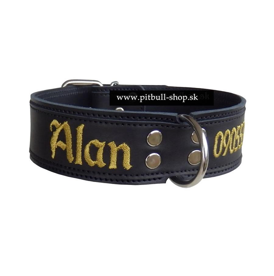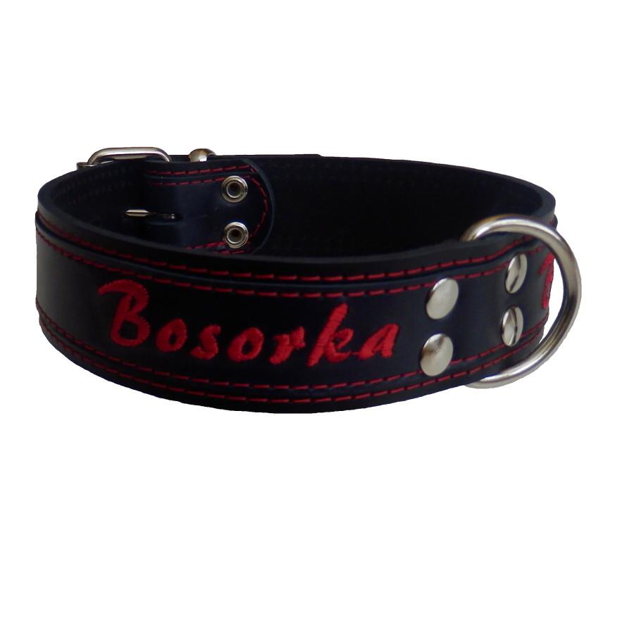 Luxusný koženný obojok s výšivkou do koži. Vyrobený z pravej hovädzej kože, odolný, vhodný pre silné plemená. Možnosť zvoliť nápis na obojku, font, a farby nite na výšivku. Šírka obojku 6cm.
