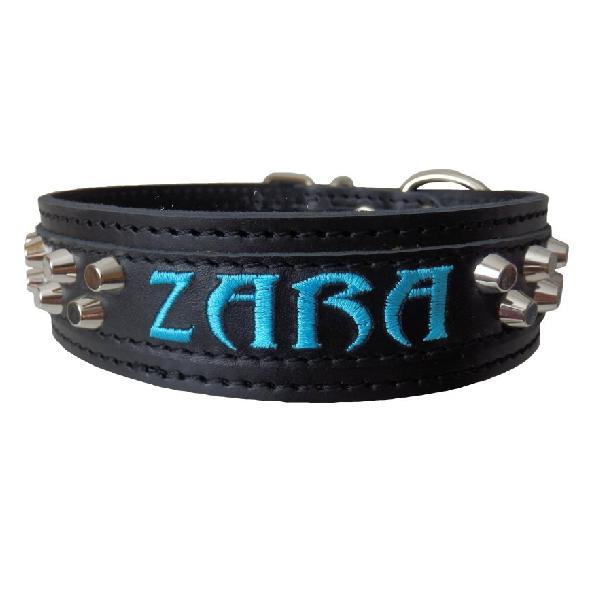 Luxusný kožený obojok s výšivkou do kože. Vyrobený z pravej hovädzej kože, odolný, vhodný pre silné plemená. Možnosť zvoliť nápis na obojku, font, a farby nite na výšivku. Šírka obojku 7cm.