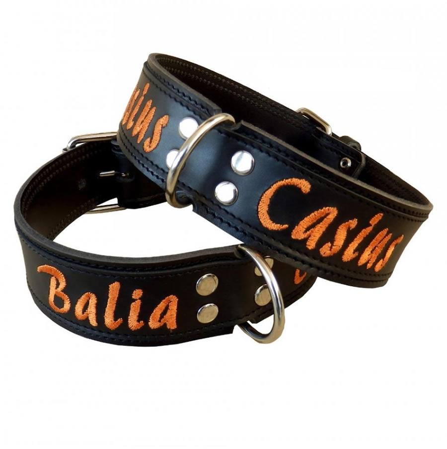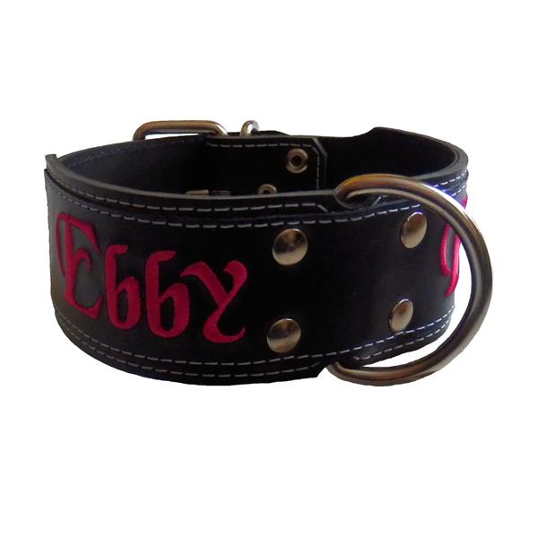 Luxusný koženný obojok s výšivkou do koži. Vyrobený z pravej hovädzej kože, odolný, vhodný pre silné plemená. Možnosť zvoliť nápis na obojku, font, a farby nite na výšivku. Šírka obojku 8cm.