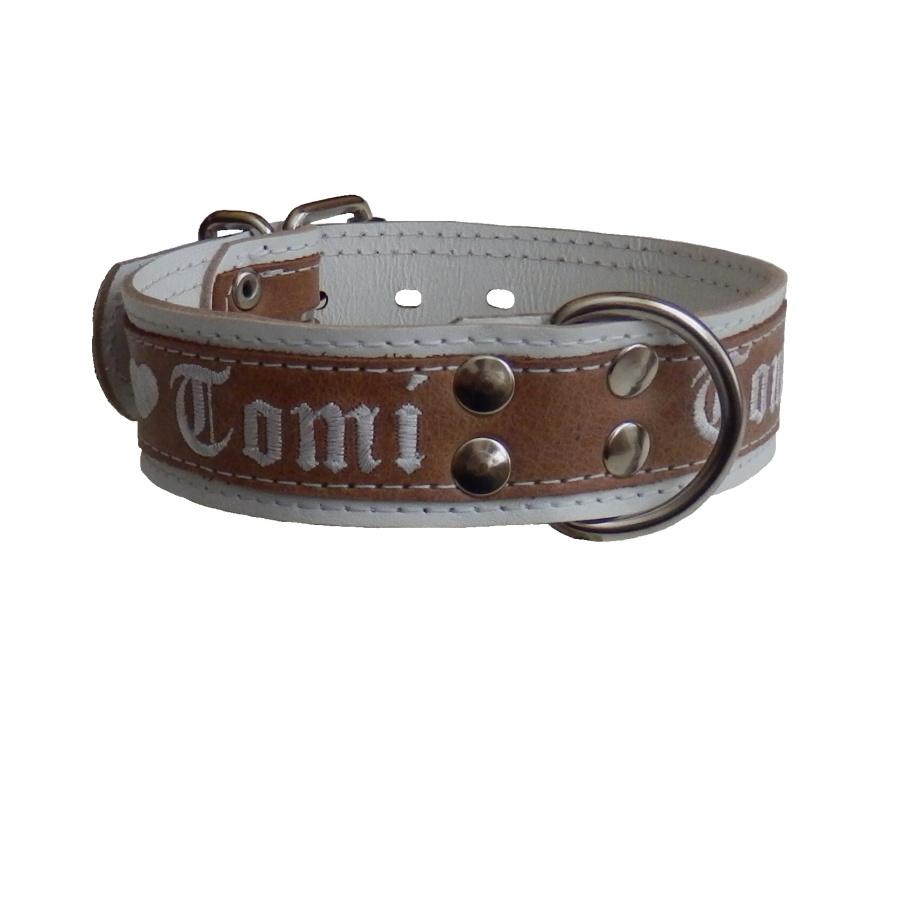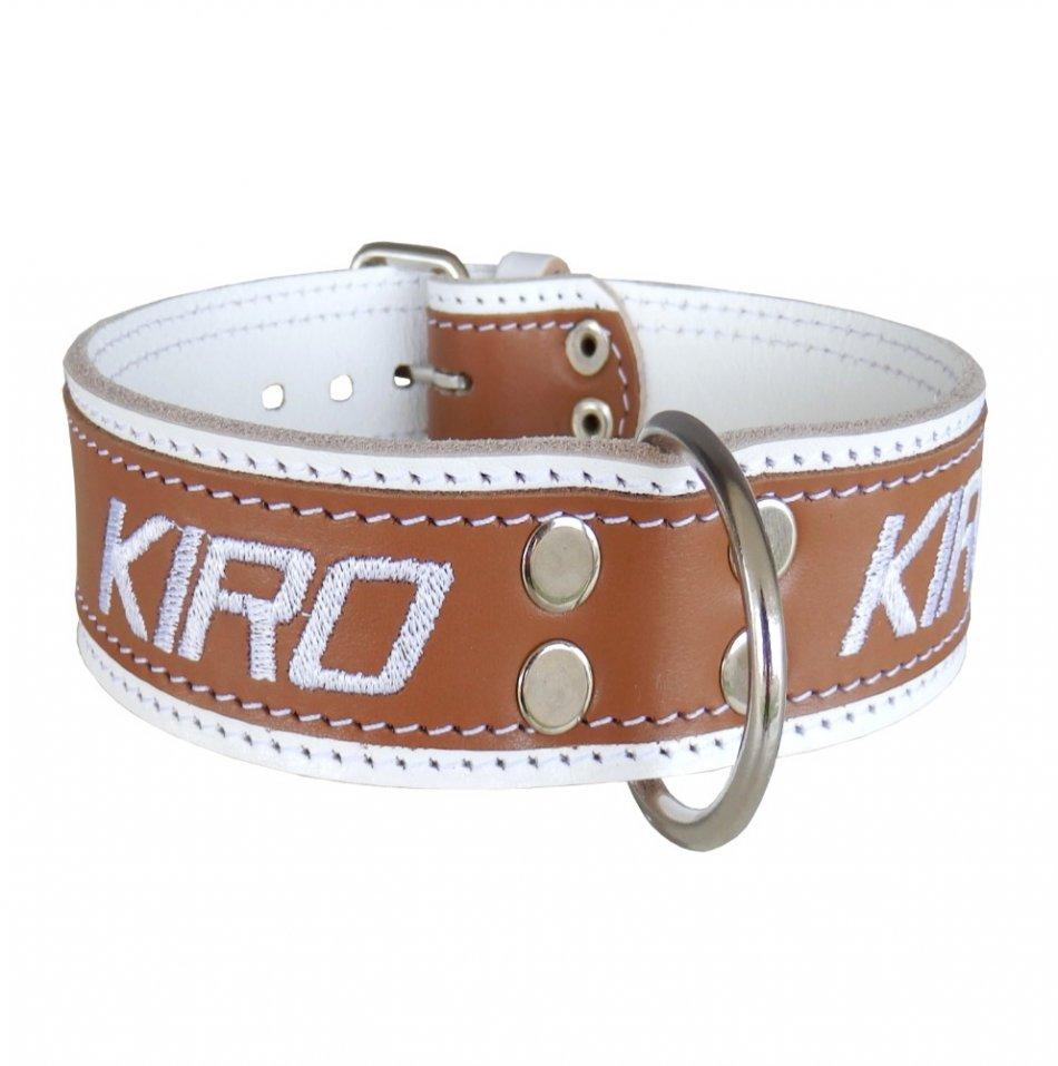 Luxusný kožený obojok s výšivkou do kože. Vyrobený z pravej hovädzej kože, odolný, vhodný pre silné plemená. Možnosť zvoliť nápis na obojku, font, a farby nite na výšivku. Šírka obojku 8cm.