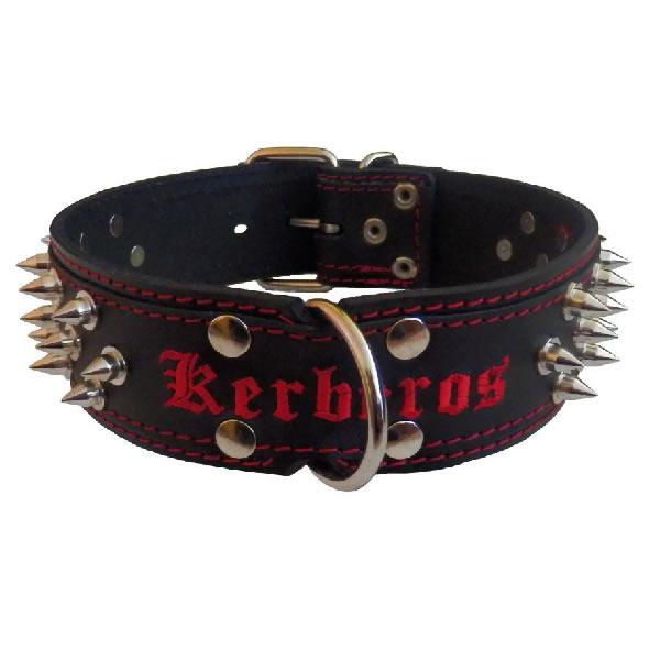 Luxusný koženný obojok s výšivkou do koži. Vyrobený z pravej hovädzej kože, odolný, vhodný pre silné plemená. Možnosť zvoliť nápis na obojku, font, a farby nite na výšivku. Šírka obojku 6cm.