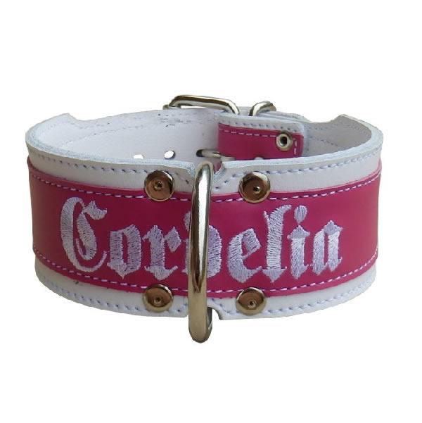 Luxusný kožený obojok s výšivkou do kože. Vyrobený z pravej hovädzej kože, odolný, vhodný pre silné plemená. Možnosť zvoliť nápis na obojku, font, a farby nite na výšivku. Šírka obojku 8cm.