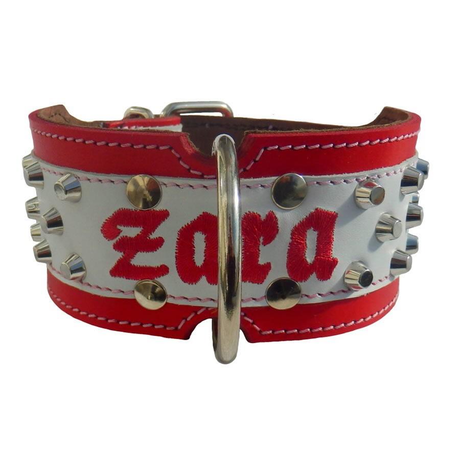 Luxusný kožený obojok s výšivkou do kože. Vyrobený z pravej hovädzej kože, odolný, vhodný pre silné plemená. Možnosť zvoliť nápis na obojku, font, a farby nite na výšivku. Šírka obojku 8cm.