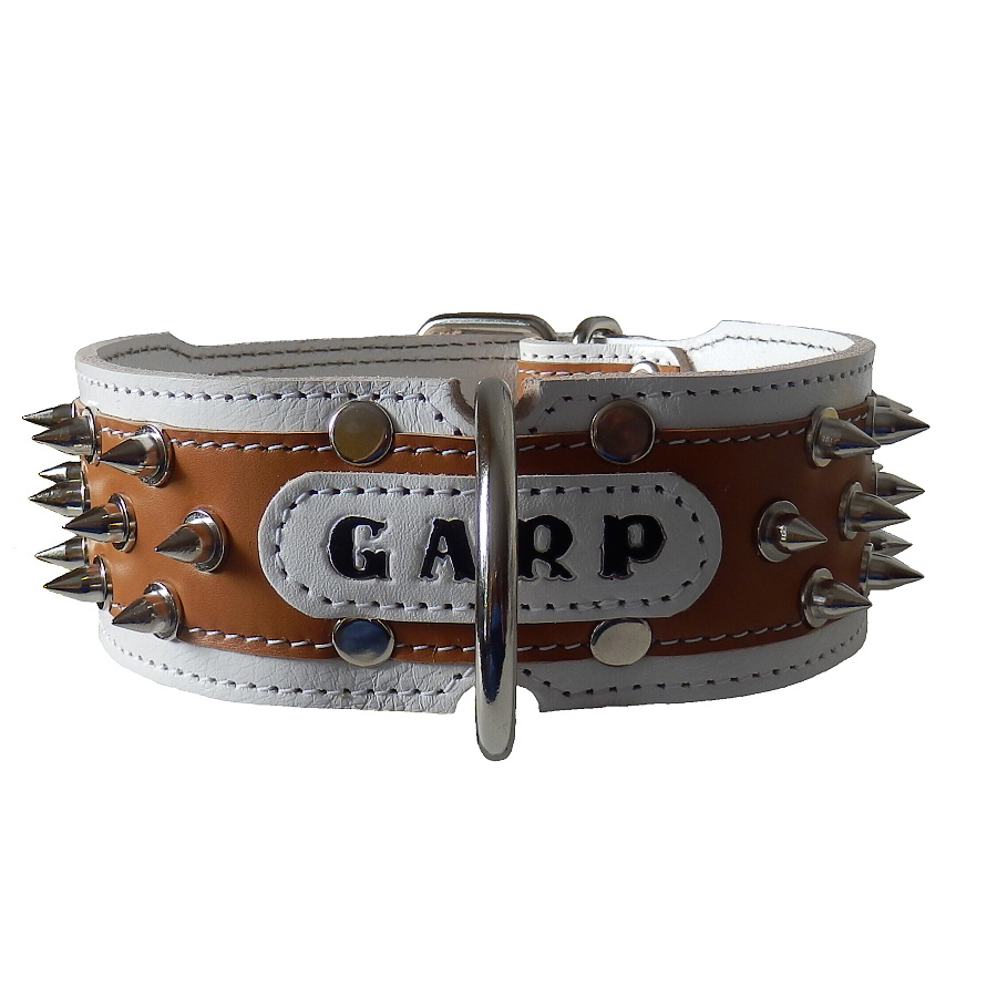 Úvod »OBOJKY»Kožené zdobené»6 cm » Obojok kožený 6cm s menom + ostne - hnedý, biely