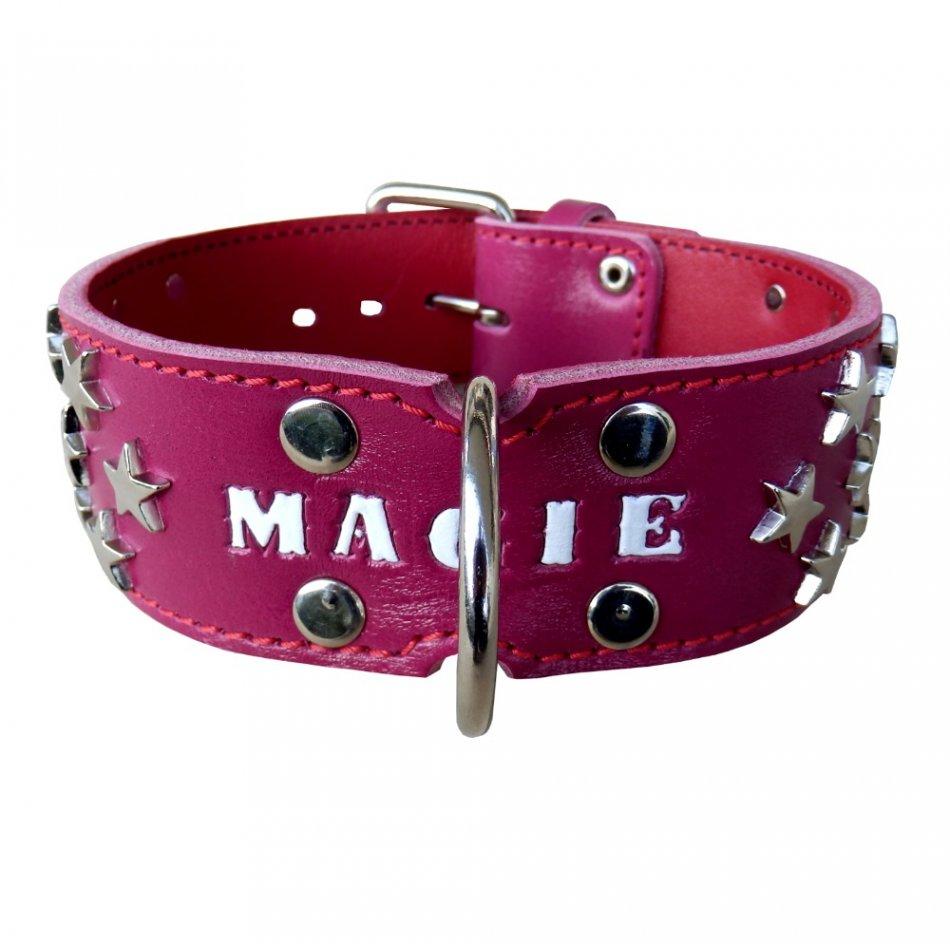 Kožený vybíjaný obojok s menom vyrobený z pravej hovädzej kože, odolný, aj na najnáročnejšie použitie vhodný pre silné plemená. Možnosť zvoliť nápis na obojku. Šírka obojku 6cm.