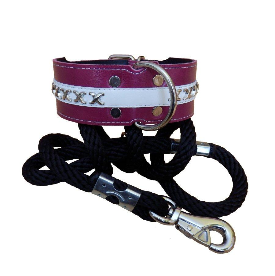 Úvod »OBOJKY»Kožené zdobené»6 cm » Obojok kožený 6cm + kríže - fialový s bielym pásom